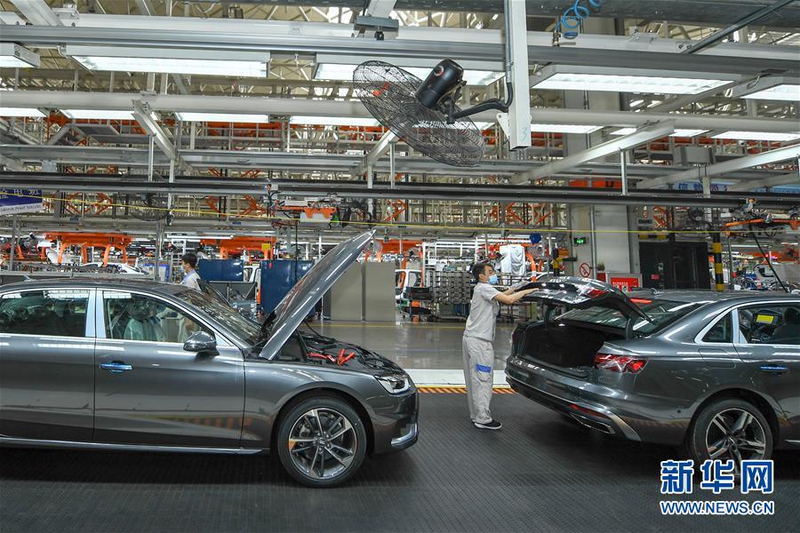 8月10日,在一汽-大眾長春基地總裝車間,工人檢查裝配好的車輛。中國第一汽車集團有限公司7月銷售整車32.2萬輛,同比增長23.2%,延續(xù)上半年的增長態(tài)勢。新華社記者張楠攝。