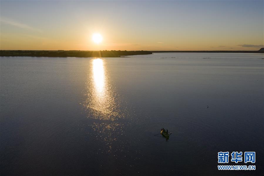 7月24日,漁民在大力加湖中捕魚(無人機(jī)照片)。大力加湖面積28.5平方公里,兩岸地勢(shì)低平,多濕地、草原,湖內(nèi)水產(chǎn)豐富。新華社記者謝劍飛攝。