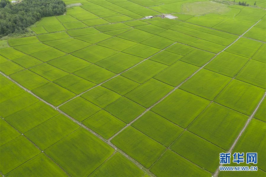 8月11日在撫遠(yuǎn)市拍攝的稻田(無人機(jī)照片)。時(shí)下,“華夏東極”黑龍江省撫遠(yuǎn)市的水稻長勢良好,蒼翠的稻田一望無際,猶如綠毯鋪在大地上。新華社記者謝劍飛攝。