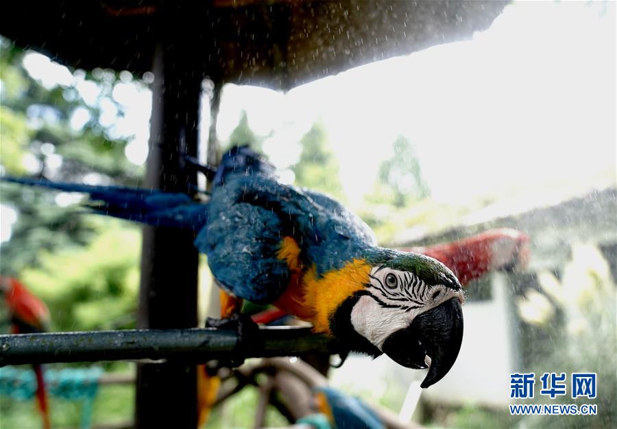 8月11日,上海動物園的金剛鸚鵡在享受噴淋降溫。當日,上海最高溫度達到35攝氏度,上海動物園開啟園內(nèi)安裝的各種噴淋裝置,讓動物們防暑降溫,樂享清涼。新華社記者張建松攝