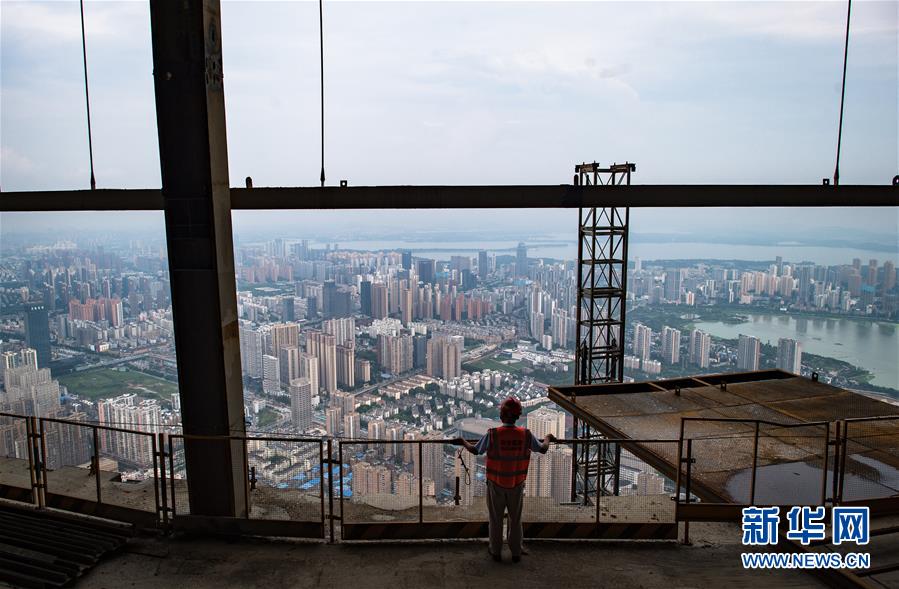 8月11日,一名工人在武漢綠地中心項目建設現(xiàn)場近500米的高空遠眺。新華社記者肖藝九攝