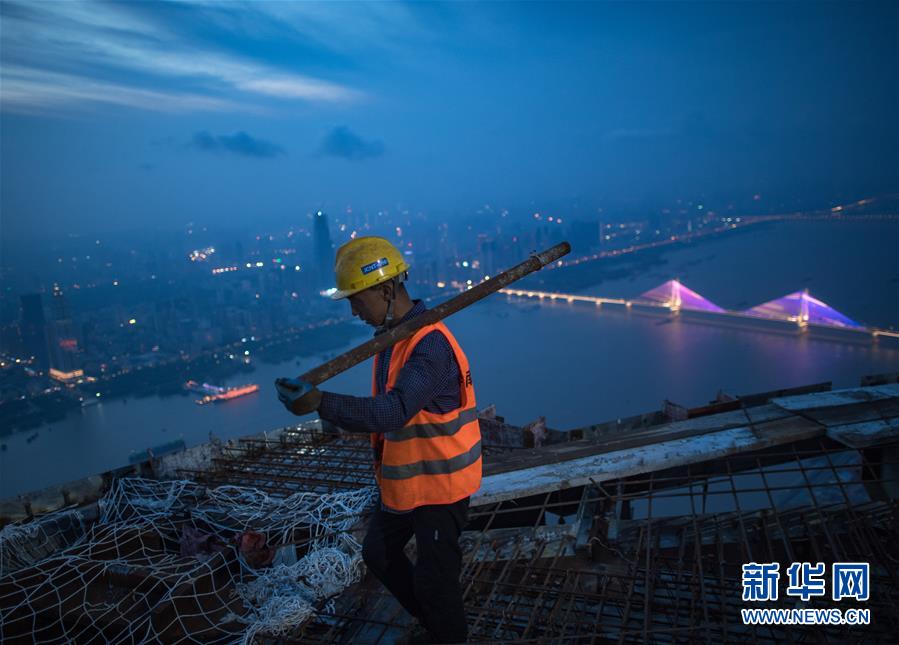 8月11日傍晚,工人在武漢綠地中心項(xiàng)目建設(shè)現(xiàn)場近500米的高空施工。新華社記者肖藝九攝