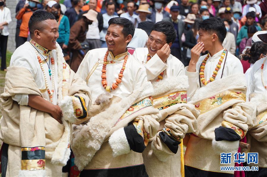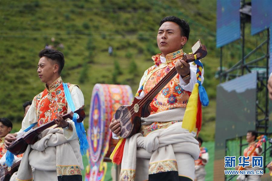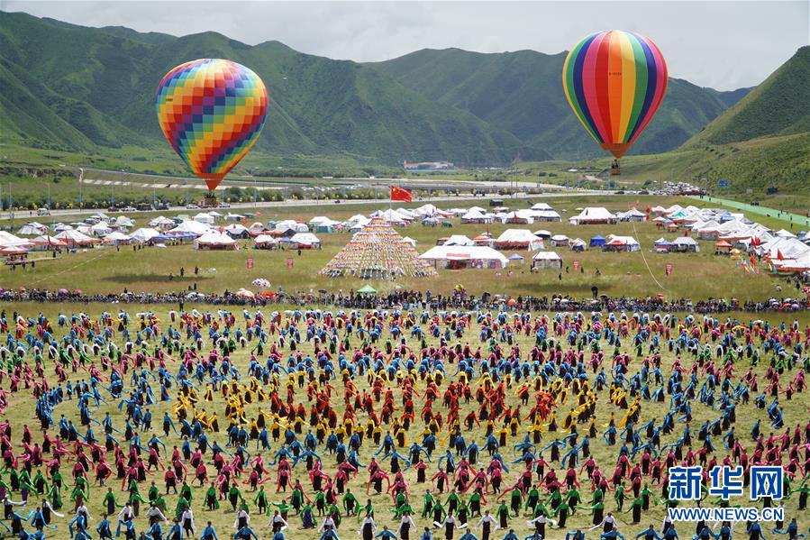 8月12日,演員在開幕式上表演舞蹈。當日,2020中國碌曲鍋莊舞展演暨甘南藏族自治州第六屆少數(shù)民族傳統(tǒng)體育運動會在甘肅省甘南州碌曲縣夏澤灘草原上舉行。開幕式上,三千余名身著節(jié)日盛裝的演員和當?shù)厝罕娫诓菰掀鹞?,雨后初晴的草原上充滿歡聲笑語。新華社記者 耿馨寧 攝