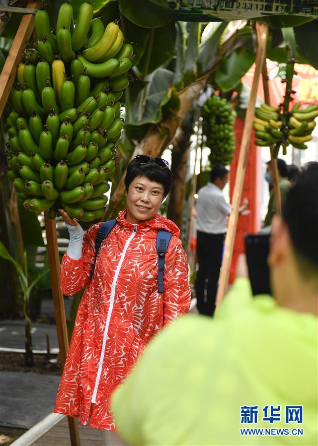 在吉林省永吉縣萬(wàn)昌鎮(zhèn)宇豐紅果木瓜產(chǎn)業(yè)園,游客與大棚內(nèi)的香蕉合影留念(8月12日攝)。新華社記者 許暢 攝