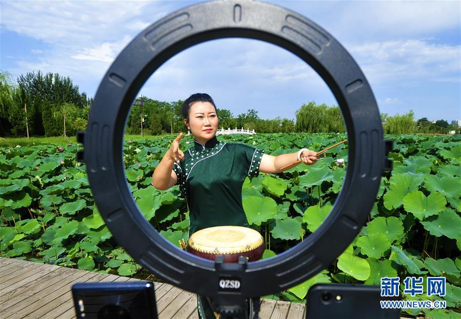 8月13日,河北省河間市西河大鼓非遺項(xiàng)目藝人李雪通過網(wǎng)絡(luò)直播表演西河大鼓。暑假期間,河北省河間市文化館推出非遺展演“云端”播系列活動(dòng),組織當(dāng)?shù)匚骱哟蠊姆沁z項(xiàng)目傳承人利用視頻直播的方式進(jìn)行線上展演,通過“云端”傳承非遺文化。新華社記者朱旭東攝