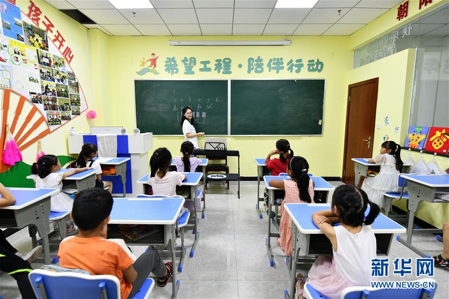 8月13日,在貴州省思南縣雙塘街道麗景社區(qū)易地扶貧搬遷安置點(diǎn),志愿者在給孩子們上音樂課。今年暑假期間,在貴州省銅仁市思南縣雙塘街道麗景社區(qū)易地扶貧搬遷安置點(diǎn),來自北京有研集團(tuán)和思南當(dāng)?shù)氐闹驹刚邆兝檬钇跁r(shí)間,給安置點(diǎn)的孩子們進(jìn)行音樂、體育、手工、安全教育等課程輔導(dǎo),幫助搬遷戶照看孩子,讓孩子們在學(xué)習(xí)中度過一個快樂而有意義的暑假。新華社記者楊文斌攝