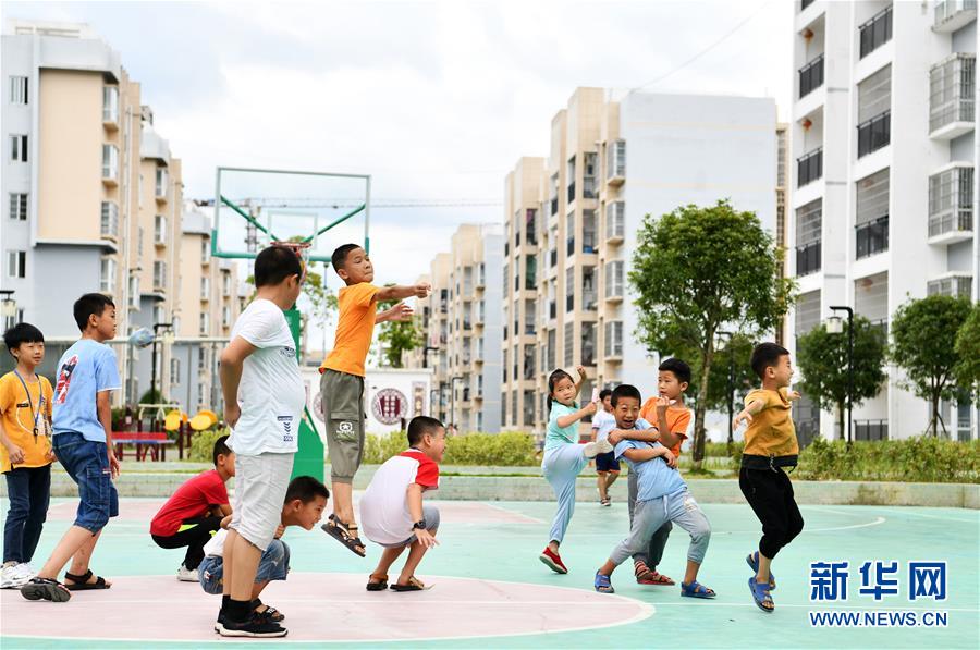 8月13日,在貴州省思南縣雙塘街道麗景社區(qū)易地扶貧搬遷安置點,孩子們和志愿者在丟沙包。新華社記者楊文斌攝