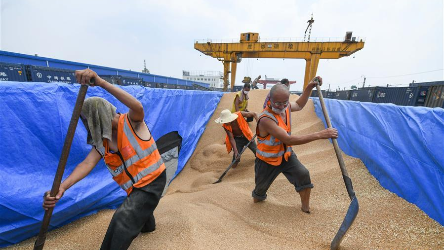 6月10日,在成都糧食集團(tuán)青白江國家糧食儲(chǔ)備庫,工人在運(yùn)糧火車的貨廂內(nèi)卸貨。
