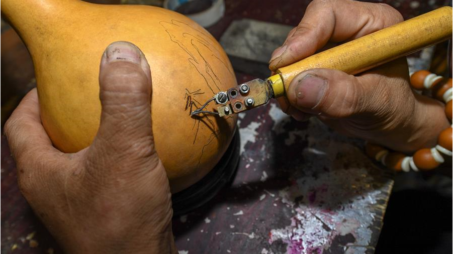 8月5日,侯景偉在葫蘆上進行創(chuàng)作。經(jīng)過多年潛心研究,他將浮雕和烙畫工藝相結(jié)合,通過拋光、起稿、雕刻、烙燙、套色等十余道工藝,制作展現(xiàn)傳統(tǒng)文化、民俗故事的葫蘆工藝品。