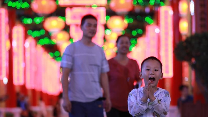 8月8日晚,市民在望京小街商業(yè)街觀看巨型人偶表演。當日,作為北京消費季活動的一部分,北京市朝陽區(qū)的“潮朝陽”消費季活動正式重啟,位于朝陽區(qū)的新興商業(yè)街望京小街舉辦開街嘉年華活動。