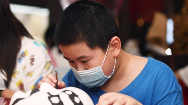 8月8日,小朋友在長沙市非物質(zhì)文化遺產(chǎn)展示館體驗湘劇臉譜繪制。暑假期間,許多小朋友來到位于湖南省長沙市橘子洲景區(qū)的長沙市非物質(zhì)文化遺產(chǎn)展示館參觀體驗。