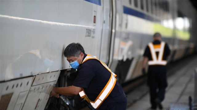 在中國鐵路上海局集團有限公司杭州北車輛段合肥運用車間,386名列車檢修工人頭頂烈日堅守崗位,確保暑運列車的安全運行。