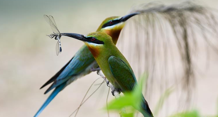 近日,不少栗喉蜂虎來到海南省??谑兄卜敝?,據(jù)??诋z榃濕地研究所工作人員統(tǒng)計(jì),目前來到??诘睦鹾矸浠⒁延薪?00只。