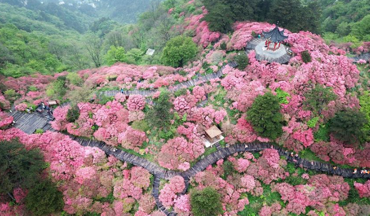 近日,湖北省麻城市龜峰山的10萬畝古杜鵑盛開,大量游客前來賞花觀景。