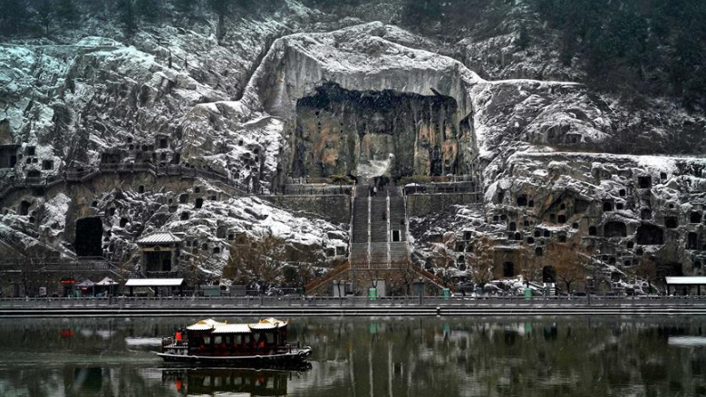 當日,雪后的河南洛陽龍門石窟景區(qū)銀裝素裹,一幅天然的水墨畫卷徐徐展開。