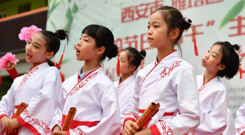 當日,陜西師范大學(xué)附屬小學(xué)在位于西安的校園里舉行傳統(tǒng)民俗活動迎接即將到來的端午節(jié)。