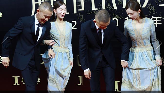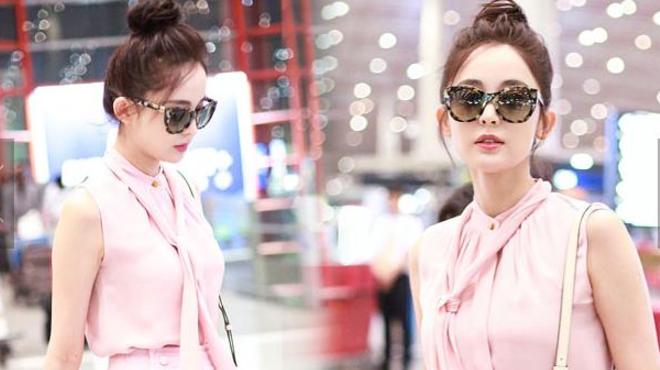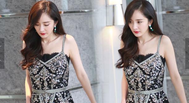 楊冪卷發(fā)成熟美露香肩 自提裙擺過酒店大堂