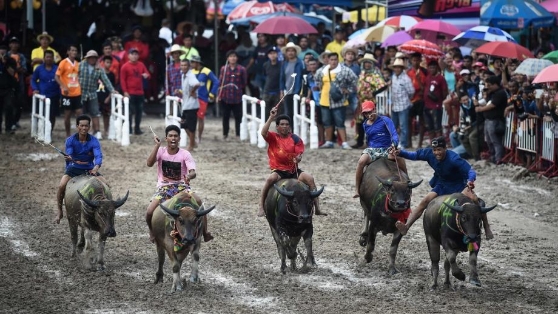 當(dāng)?shù)貢r(shí)間2019年10月12日,泰國春武里舉行一年一度的水牛賽跑,選手騎??癖?。