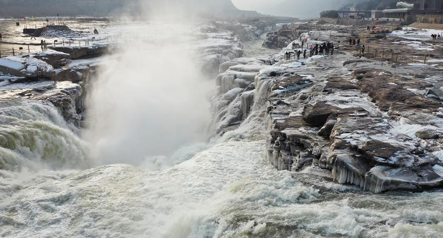 隆冬時(shí)節(jié),位于晉陜交界的黃河壺口瀑布飛濺的浪花在瀑布兩岸巖石上凝結(jié)形成冰瀑冰雕,成為冬季壺口瀑布景區(qū)一道奇特的景觀,吸引游人前往觀賞。