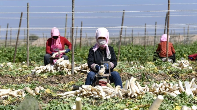 近日,寧夏吳忠市紅寺堡區(qū)馬渠生態(tài)移民安置區(qū)的7000畝蘿卜喜獲豐收,農(nóng)民在田間地頭拔蘿卜、切蘿卜、曬蘿卜,一片忙碌。