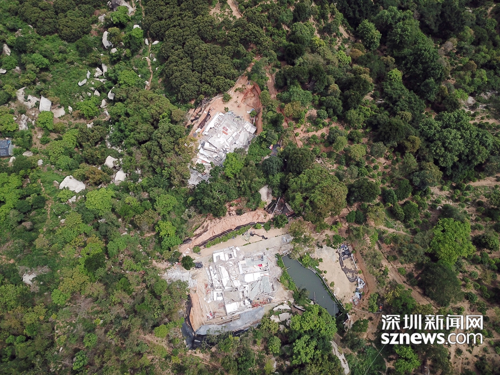 5月16日,深圳新聞網(wǎng)記者爬上羊臺山,用無人機和相機拍下羊臺山毀林案件涉案的兩棟違法建筑拆除后的情景。