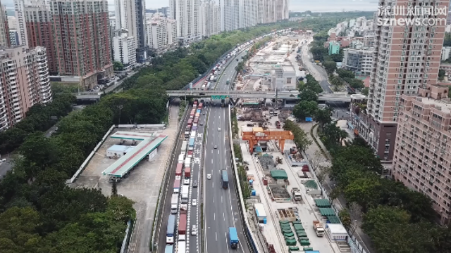 從百米高空俯瞰廣深高速,12時33分,記者發(fā)現(xiàn)該路段仍大排長龍,貨柜車在高速路段蔓延,看不到盡頭。