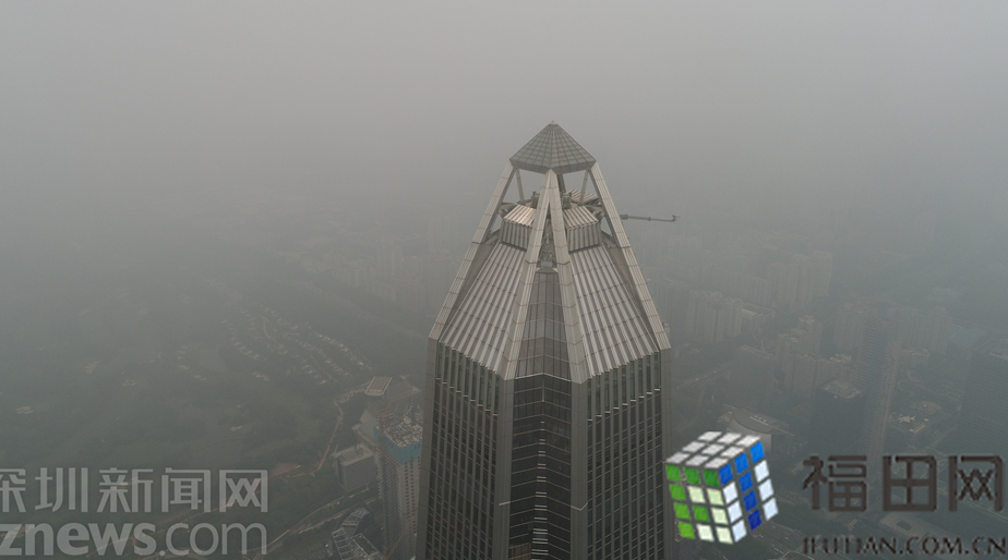 無人機航拍福田中心區(qū)的灰霾,在海拔500米左右的高空,無人機的視線就被灰霾完全擋住。