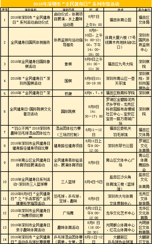 其中,市文體旅游局將于8月7日,在福田體育公園舉辦全民健身日啟動儀式,屆時將有體育項目展演、水上趣味運動薈等項目上演。此外,全市還將組織舉辦適合不同人群的“全民健身活動展示”、“全民健身嘉年華”活動,如全民健身科普宣傳、咨詢輔導、項目推廣、交流展示以及比賽等;面向全市市民舉辦大型國民體質(zhì)監(jiān)測、健身咨詢、大講堂等科學健身指導活動;引導和動員各級社會體育指導員開展義務健身輔導,利用豐富的體育專業(yè)技術(shù)知識,深入開展全民健身志愿服務活動,免費向市民開放市屬公共體育場館(深圳體育館、深圳游泳跳水館、深圳網(wǎng)球中心、深圳體育場等四家體育場館)等。