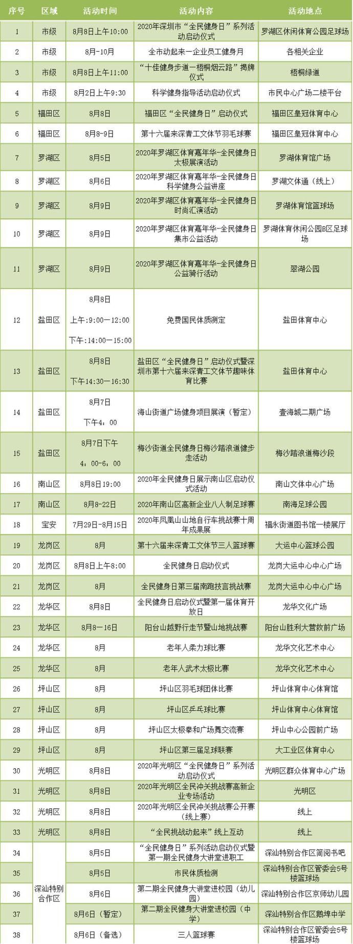 在啟動當日,全市各區(qū)也同步聯(lián)動,啟動了“全民健身日”系列活動。即日起至8月10日,深圳將陸續(xù)推出近40項全民健身運動系列活動,內(nèi)容涵蓋來深青工文體節(jié)、企業(yè)員工健身月、體育嘉年華系列展演、全民沖關(guān)線上挑戰(zhàn)賽、足球、籃球、老年太極、柔力球、國民體質(zhì)測定、全民健身大講堂、健身步道健步行等。此外,全市各公益體育館也將面向市民免費開放,大家可關(guān)注各場館進行預(yù)約。