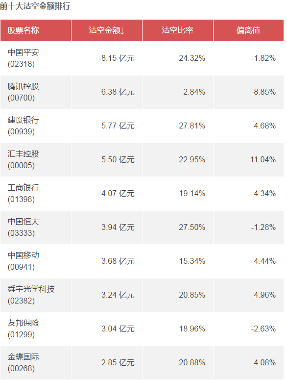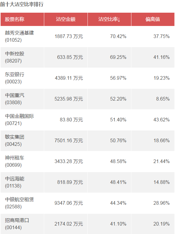 智通財(cái)經(jīng)APP數(shù)據(jù)顯示,越秀交通基建(01052)、中新控股(08207)、東亞銀行(00023)上一交易日沽空比率位于前三位,分別為70.42%、69.25%、56.97%。中國平安(02318)、騰訊控股(00700)、建設(shè)銀行(00939)的沽空金額位居前三,分別為8.15 億元、6.38 億元、5.77 億元。中國金融國際(00721)、中新控股(08207)、越秀交通基建(01052)的偏離值位居前三,分別為43.62%、41.16%、37.75%。具體情況如下: