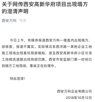 關(guān)于網(wǎng)傳萬(wàn)科西安高新華府項(xiàng)目出現(xiàn)塌方的澄清聲明如下: