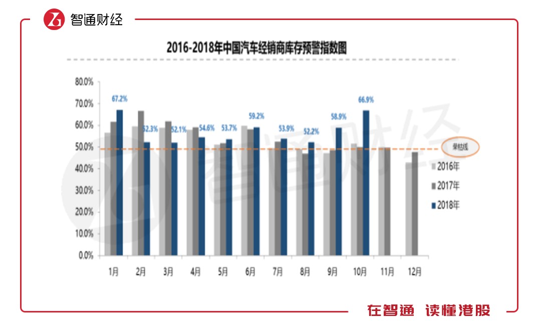 實(shí)際上,從汽車制造到最終消費(fèi)者,流通過(guò)程要通過(guò)經(jīng)銷商,中汽協(xié)近日公布了經(jīng)銷商庫(kù)存預(yù)警指數(shù),顯示下半年以來(lái),庫(kù)存預(yù)警指數(shù)均高于前兩年,10月份創(chuàng)出新高,預(yù)警指數(shù)達(dá)66.9%,而榮枯線為50%,汽車庫(kù)存堪憂,未來(lái)兩個(gè)月消化難度依然很大。