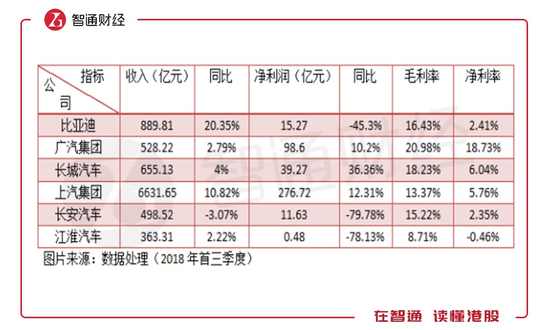 從抽樣的標(biāo)的看,2018年首三季度比亞迪(01211)的收入增速是最快的,其次是上汽集團(tuán),其余標(biāo)的增速單位數(shù)甚至是負(fù)增長(zhǎng),在此次標(biāo)的中,沒(méi)有自主品牌龍頭吉利汽車(00175),不過(guò)以該公司上半年的收入增速看,和比亞迪是同一個(gè)高增長(zhǎng)賽道。在盈利上,各個(gè)車企差異還是挺大的,不過(guò),在這塊操作靈活性較大。