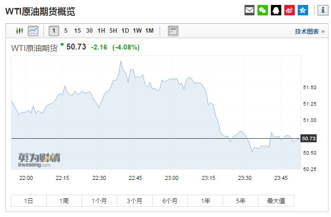 截至發(fā)稿,WTI原油跌4.08%報(bào)50.73美元/桶。