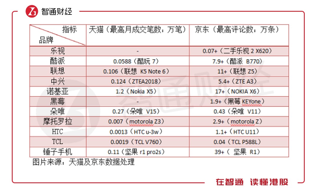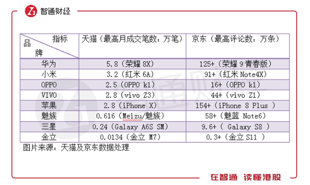 電商的崛起讓手機(jī)多了一條網(wǎng)絡(luò)強(qiáng)大的銷售渠道,目前天貓和京東是電商平臺中的兩大巨頭,國內(nèi)的最終商品基本在這兩大平臺售賣。智通財經(jīng)APP通過天貓及京東相對應(yīng)的月成交筆數(shù)及評論數(shù)了解不同品牌的智能手機(jī)售賣情況。