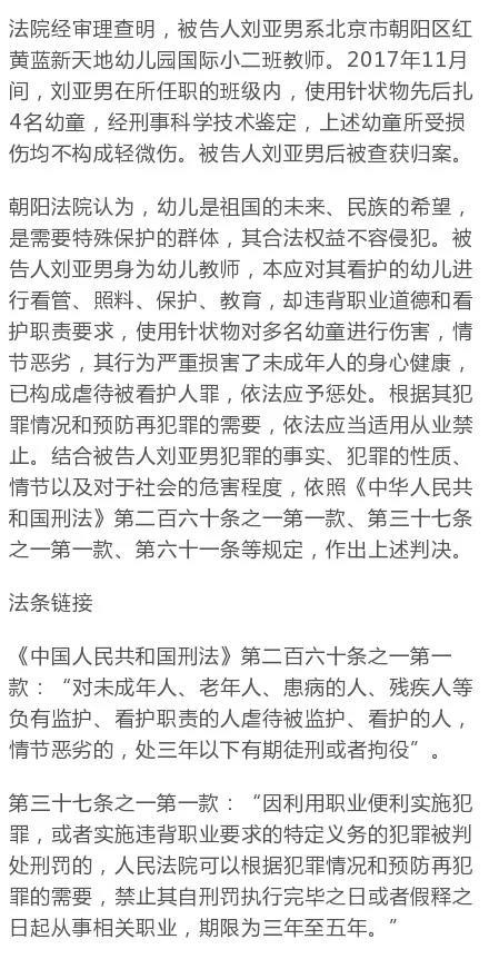 12月26日上午,北京市朝陽區(qū)人民法院依法對(duì)被告人劉亞男(紅黃藍(lán)幼兒園教師)虐待被看護(hù)人案公開宣判,以虐待被看護(hù)人罪一審判處劉亞男有期徒刑一年六個(gè)月。