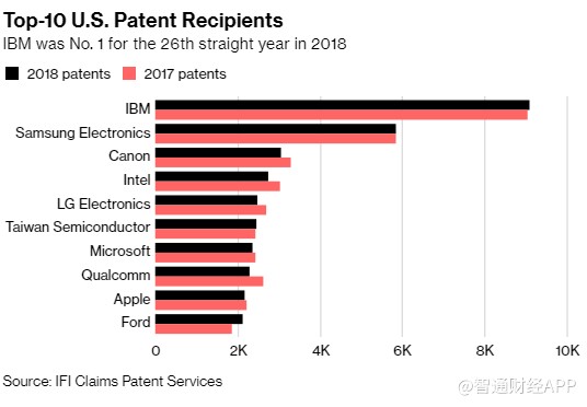根據(jù)Fairview Research旗下IFI Claims Patent Services的分析,僅IBM一家公司就獲得了9100項(xiàng)專(zhuān)利,保住了其第一名的位置,并將IBM的連勝時(shí)間延長(zhǎng)到了26年。