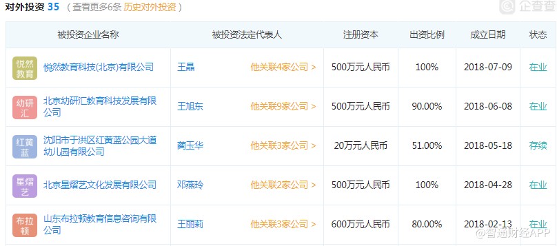不過,在內(nèi)地業(yè)務上,該公司今后的發(fā)展方向或也會出現(xiàn)一些變化,教育衍生品或?qū)⑹窃摴就顿Y方向,以該公司2018年投資的標的來說,根據(jù)企查查的數(shù)據(jù),該公司投資成立的大部分是教育相關的服務。以下為企查查搜到的紅黃藍2018年投資成立的項目: