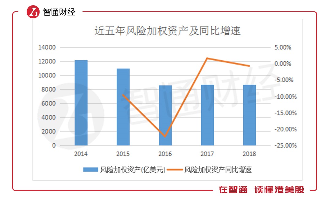 風險加權(quán)資產(chǎn)方面表現(xiàn)與總資產(chǎn)類似,于2017年大幅增長,至去年有所回落。據(jù)智通財經(jīng)APP了解,2018年,匯豐控股風險加權(quán)資產(chǎn)達8653.18億美元,同比下降0.69%。