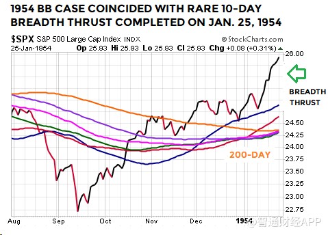 1954年1月25日時的廣量沖力指標如下圖所示,在4個交易日前,布林通道月線圖出現(xiàn)前述形態(tài)。與2019年相似的是,當時的點位接近200日均線的水平: