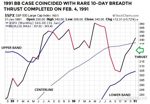 上述布林通道技術(shù)形態(tài)屬較為罕見的類型。值得注意的是,1954年和1991年時的另一技術(shù)指標,廣量沖力指標,基本上與2019年1月21日出現(xiàn)的廣量沖力指標形態(tài)類似。因此,在1954年、1991年和2019年,標普500指數(shù)走出了布林通道及廣量沖力指標都相似的技術(shù)形態(tài)。