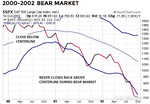 2000-02年熊市也是如此,標普500指數(shù)在2000年第四季度跌破中軌以后,就無法重新回到布林通道中軌之上。如下圖所示,第四季度之后情況進一步惡化。2001年2月標普500指數(shù)收于下軌以下: