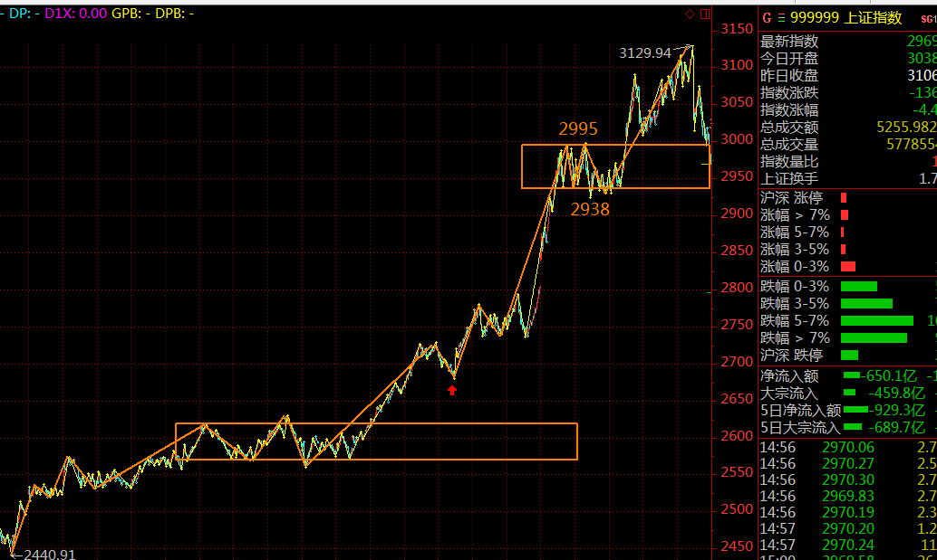 可以很明顯的看出,這是一波五分鐘級(jí)別的雙中樞上漲,這波上漲隨著周五尾盤跌入2995點(diǎn)結(jié)束。市場(chǎng)在后續(xù)的演化過(guò)程中會(huì)做出選擇:開始五分鐘級(jí)別下跌趨勢(shì),或者圍繞著五分鐘上漲趨勢(shì)的最后一個(gè)中樞進(jìn)行行情級(jí)別擴(kuò)張。不論哪種情況,從纏論的視角,短期這輪上漲趨勢(shì)暫告一段落,3129.94點(diǎn)即是五分鐘趨勢(shì)的第一類賣點(diǎn),在下周,市場(chǎng)企穩(wěn)后,大概率會(huì)上沖構(gòu)建第二類賣點(diǎn)。