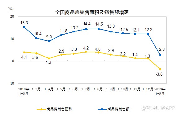 1-2月份,商品房銷售面積14102萬(wàn)平方米,同比下降3.6%,2018年全年為增長(zhǎng)1.3%。其中,住宅銷售面積下降3.2%,辦公樓銷售面積下降15.7%,商業(yè)營(yíng)業(yè)用房銷售面積下降13.6%。商品房銷售額12803億元,增長(zhǎng)2.8%,增速回落9.4個(gè)百分點(diǎn)。其中,住宅銷售額增長(zhǎng)4.5%,辦公樓銷售額下降6.2%,商業(yè)營(yíng)業(yè)用房銷售額下降9.4%。