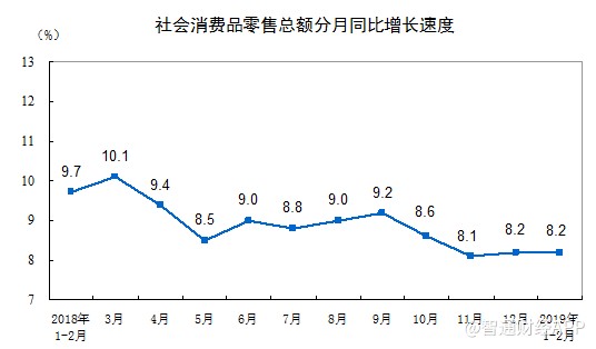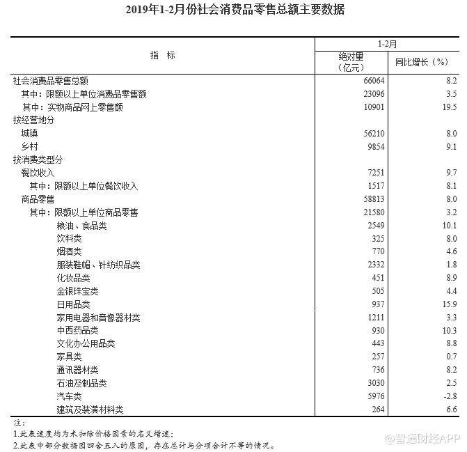 智通財(cái)經(jīng)APP獲悉,國家統(tǒng)計(jì)局公布,2019年1-2月份,社會消費(fèi)品零售總額66064億元,同比名義增長8.2%,符合預(yù)期,但低于前值增長9%。其中,限額以上單位消費(fèi)品零售額23096億元,增長3.5%。