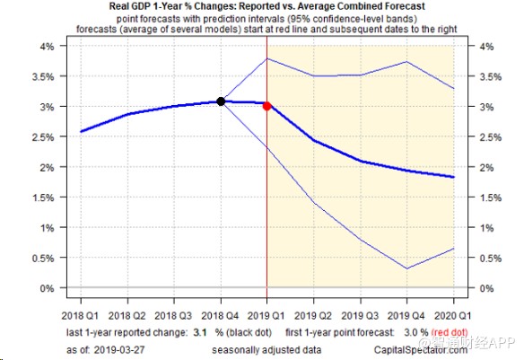 每季度更新的GDP同比數(shù)據(jù)趨勢(shì)也表明,美國(guó)經(jīng)濟(jì)出現(xiàn)下滑。《資本觀察家》通過(guò)一系列綜合預(yù)測(cè)得出的平均預(yù)測(cè)值顯示,今年第一季度的同比增幅將從去年第四季度的3.1%小幅降至3.0%,并在未來(lái)幾個(gè)季度繼續(xù)走軟。如果預(yù)測(cè)無(wú)誤,這一同比增幅將出現(xiàn)自2016年第二季度以來(lái)的首次下降。