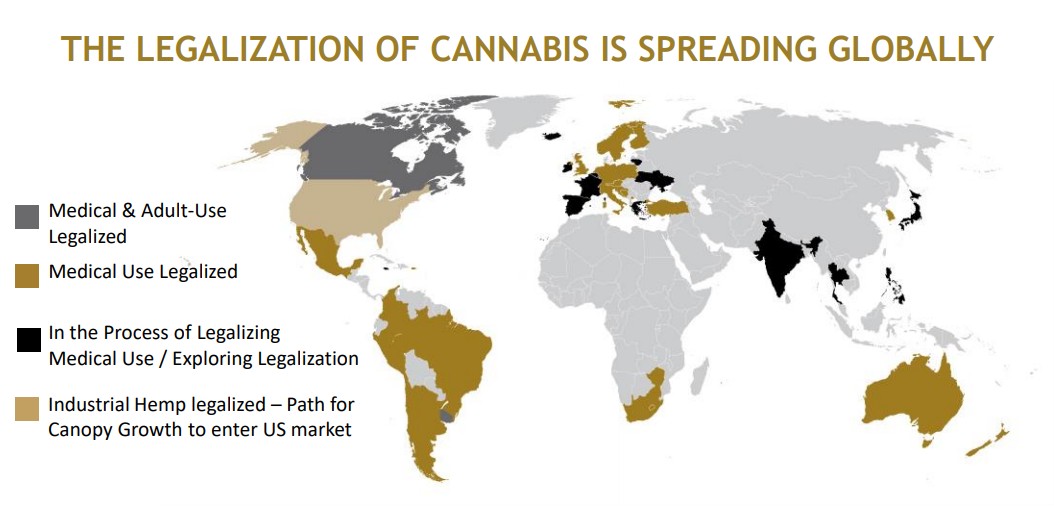 下圖是全球最大的工業(yè)大麻生產(chǎn)商CANOPY GROWTH披露的全球大麻推廣情況圖,從中可以很清晰的看到這一新興行業(yè)政策解禁的進(jìn)程,而且基本可以確定的是,未來灰色的區(qū)域會(huì)越來越少。