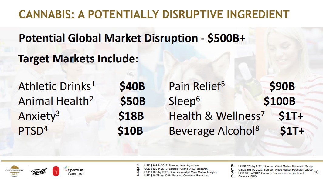 CANOPY GROWTH根據(jù)Allied Market Research Group等調(diào)研機(jī)構(gòu)按照不同用途做了一組測算,未來該行業(yè)的將會(huì)滲透全球至少5000億美元的市場: