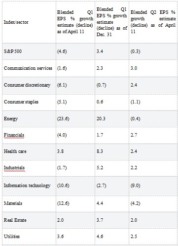 截至上周三下午,標(biāo)準(zhǔn)普爾500指數(shù)成份股的505家企業(yè)中有25家公布了業(yè)績,綜合增長預(yù)期為-4.6%,11個行業(yè)中有8個預(yù)計每股收益將同比下降。這大大低于截至12月31日預(yù)計的增幅(3.0%)。