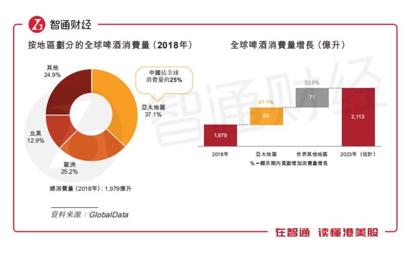 從行業(yè)角度來看,根據(jù)GlobalData的數(shù)據(jù),截至2018年,按消費量及價值計算,亞太地區(qū)是全球最大啤酒消費市場,也是全球啤酒銷量增速最快的地區(qū)之一。2018年亞太占全球啤酒銷量的37%,且預(yù)計2018年至2023年將貢獻全球啤酒銷量增幅的47%。